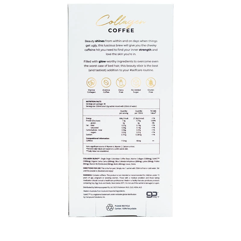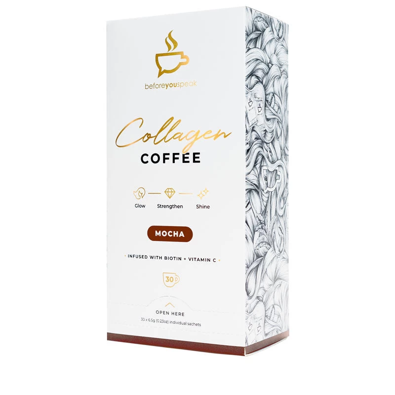 Elevate your morning ritual with a delicious cup of Beforeyouspeak Coffee’s Collagen Coffee. Designed to help improve your skin, hair and nail health, this revolutionary blend combines Marine Collagen, MCT Oil, Proline and Camu Camu and is enhanced with a delicious Mocha flavour. Includes 30 serves.