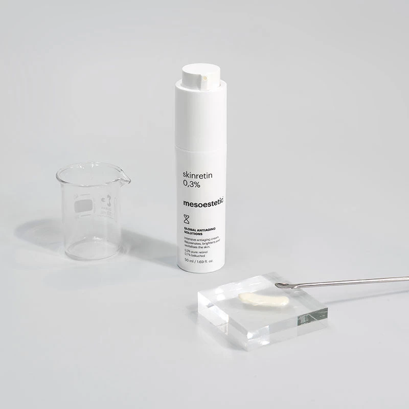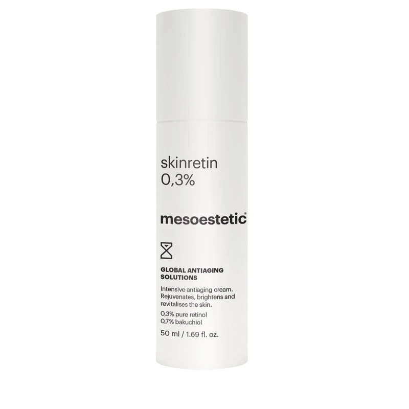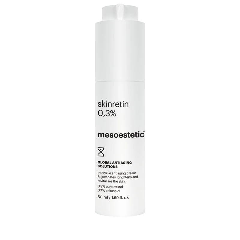 Brighten, rejuvenate and revitalise ageing skin with Mesoestetic’s Skinretin 0.3%. This intensive cream works to target multiple signs of ageing such as deep wrinkles and expression lines, irregular tone, loss of luminosity, skin density and elasticity. Formulated with a powerful combination of 0.3% pure retinol and 0.7% bakuchiol for an intensive regenerating and renewing action, this nighttime treatment has a light and comfortable texture that is suited to all skin types.