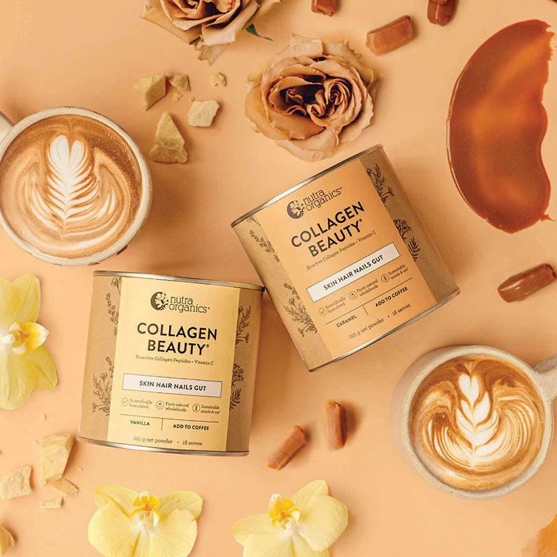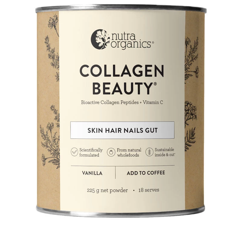 Enjoy optimal skin, hair, nail and gut health with Nutra Organics Collagen Beauty in Vanilla. Low in sugar, soft, creamy and a delicious way to enjoy the benefits of Collagen Beauty, this all-natural formula is made with only pure wholefood ingredients and contains Verisol® Bioactive Collagen Peptides & Vitamin C.  The perfect addition to your morning coffee or favourite hot drink, this skin-loving blend not only tastes delicious, but also helps to reduce the appearance of skin wrinkles, smooths fine lines, and supports healthy hair & nails.Â