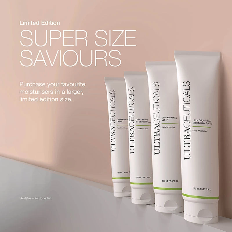 Instantly soothe, nourish and calmΒ hypersensitive skin with this very gentle, soothing moisturiser from Ultraceuticals. The nourishing formula instantly cools, calms and moisturises sensitised skin while minimising discomfort after exposure to climatic elements such as heat or wind and environmental triggers. Featuring a prebiotic ingredient (Inulin & alpha-glucan oligosaccharide) to balance the skin’s microbiome and help reinforce the skin’s natural protective barrier, and enhanced with Sodium Hyaluronate to support the skin’s Natural Moisturising Factor, this non-comedogenic and hypoallergenic formula leaves skin feeling intensely hydrated, calm and comforted. This limited edition supersize is valued at $204.00!